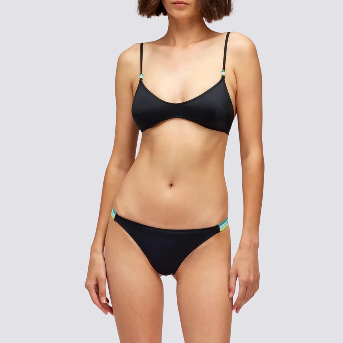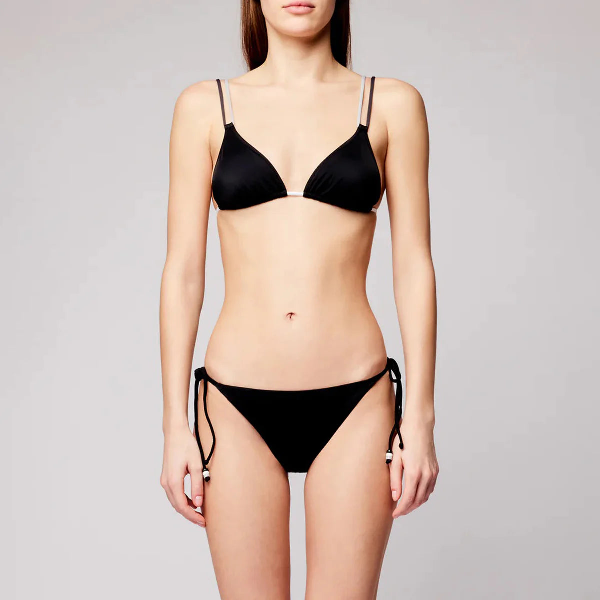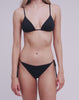 El top triangular, combinado con la parte baja con lazos laterales, es perfecto para un look divertido y para quienes buscan un ajuste personalizado. El top triangular es uno de los estilos más clásicos y versátiles. Los lazos permiten ajustar el nivel de sujeción y el escote según tus preferencias. Gracias a ellos, el ajuste se adapta a tu figura. Ofrece una buena libertad de movimiento, ideal para tomar el sol y nadar. Es especialmente adecuado para tallas chicas y medianas. La parte baja del bikini con lazos laterales ajustables es un estilo versátil muy apreciado por su capacidad de adaptarse a distintos tipos de cuerpo. La característica distintiva de este modelo son los lazos en las caderas, que pueden ser más o menos finos y permiten ajustar la altura de la braguita en las caderas e, incluso, en algunos casos, la cobertura trasera, apretándolos o aflojándolos. Gracias a los lazos ajustables, el corte de la pierna se puede adaptar a tu gusto, ofreciendo diferentes opciones de estilo y ajuste.