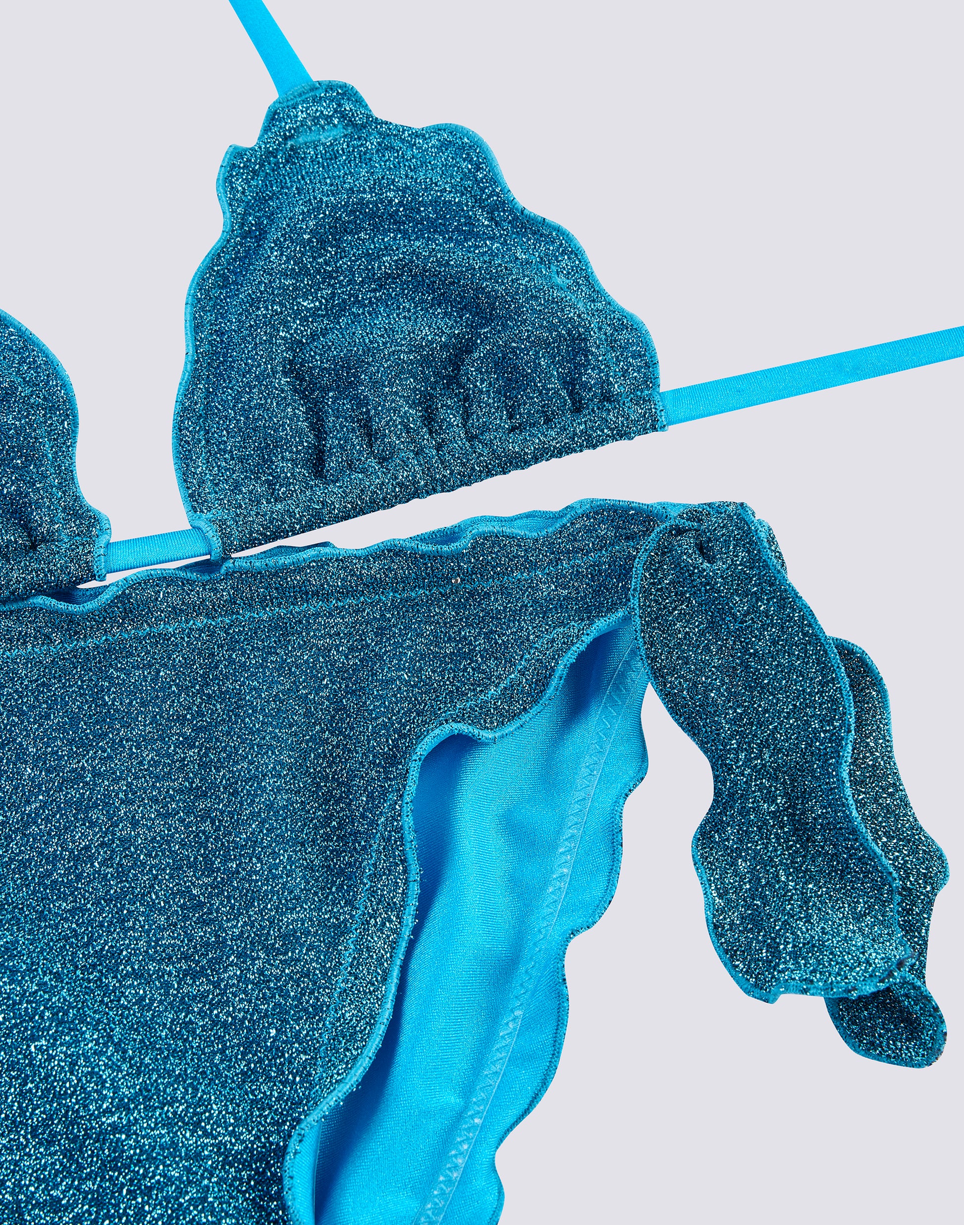 Los ribetes con volantes y el tejido con lúrex le dan un toque especial a este bikini, que ofrece un ajuste perfecto gracias al top con tirantes ajustables y la parte inferior con lazos laterales. Ideal para disfrutar todos los días de sol y mar con estilo y comodidad.