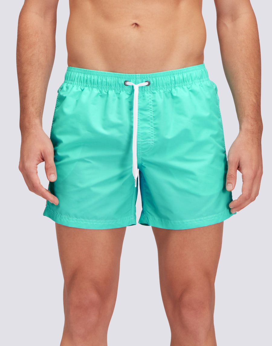 Traje de baño corto con cintura elástica, jareta ajustable y el icónico arcoíris de Sundek en la parte trasera. Confeccionado con costuras de triple aguja y elaborado 100% en nuestro histórico tafetán de nailon, suave como la seda, ligero y altamente resistente. Su secado ultrarrápido te brinda máxima comodidad tanto dentro como fuera del agua. Largo: 14 pulgadas / 36 cm (talla M), medido desde la parte exterior de la pierna.