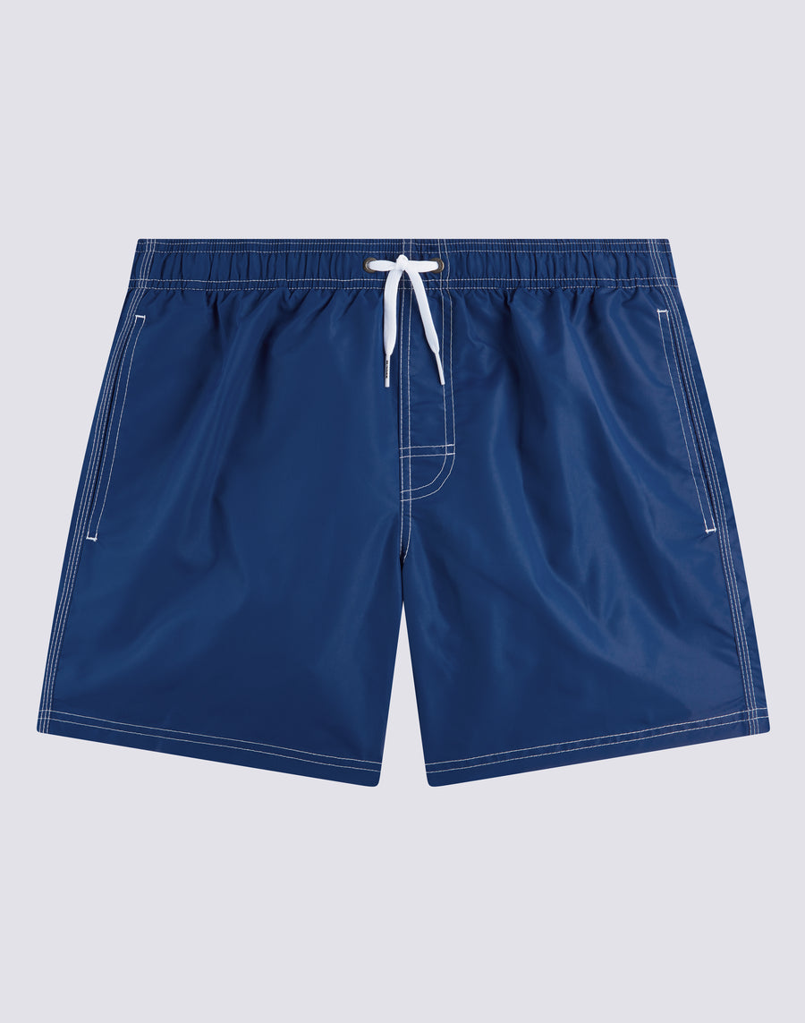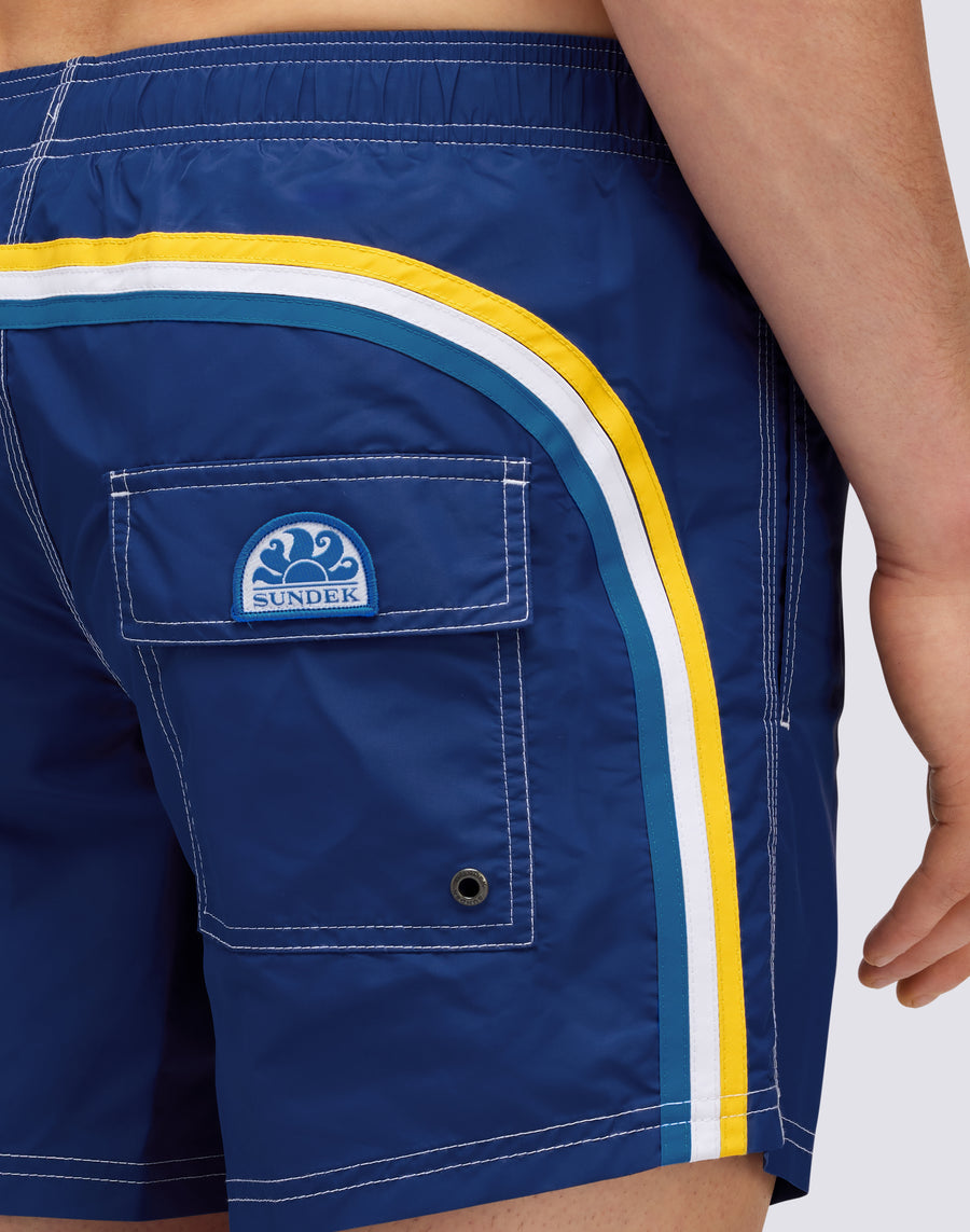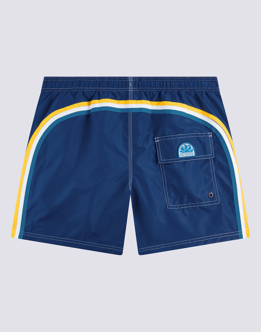 Traje de baño corto con cintura elástica, jareta ajustable y el icónico arcoíris de Sundek en la parte trasera. Confeccionado con costuras de triple aguja y elaborado 100% en nuestro histórico tafetán de nailon, suave como la seda, ligero y altamente resistente. Su secado ultrarrápido te brinda máxima comodidad tanto dentro como fuera del agua. Largo: 14 pulgadas / 36 cm (talla M), medido desde la parte exterior de la pierna.