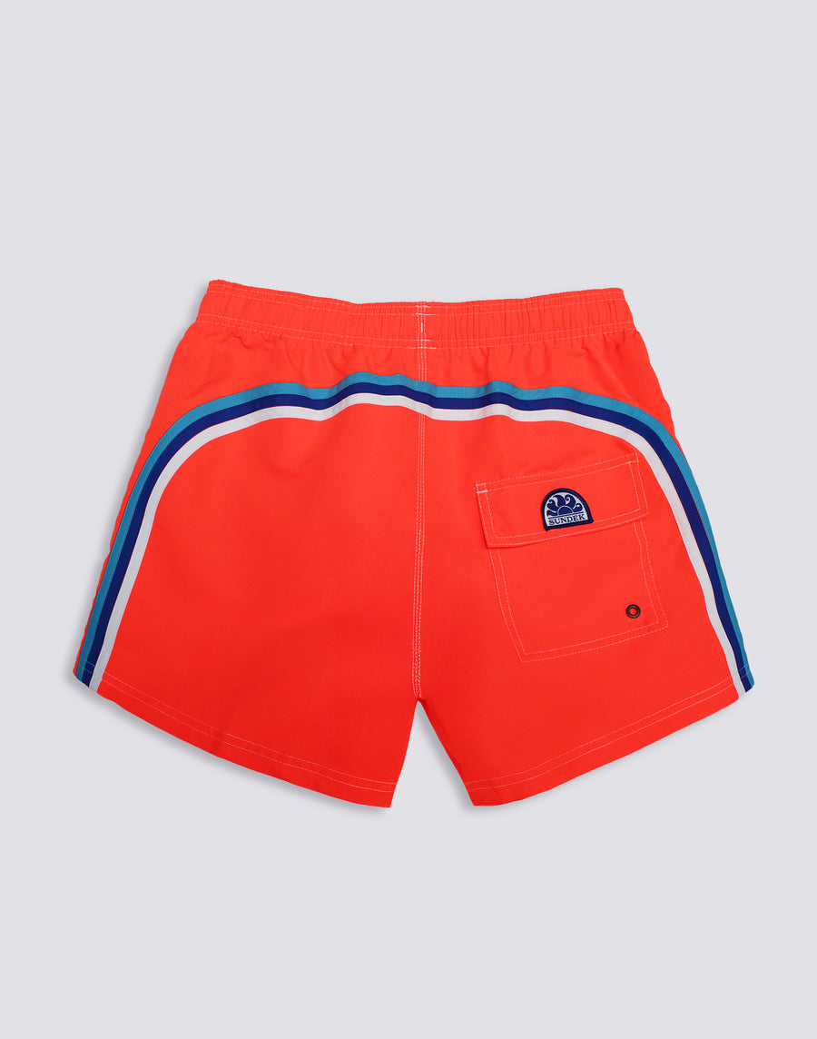 Traje de baño para hombre con cintura elástica, cordón ajustable y el icónico arcoíris de Sundek en la espalda. Este modelo está confeccionado con costuras de tres agujas y elaborado al 100% con nuestro tejido heritage de nailon-tafetán: suave como la seda, ligero, resistente a todo y de secado ultrarrápido para brindarte comodidad dentro y fuera del agua. Longitud: 35 cm (talla M), medido en el exterior de la pierna.