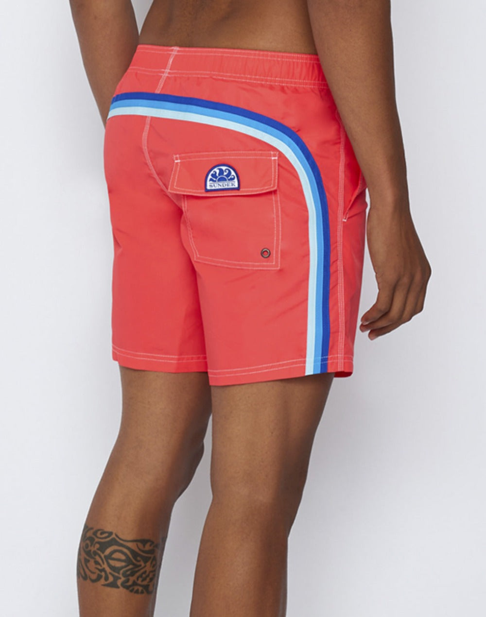 Todo el estilo atemporal de Sundek en este traje de baño con cintura elástica. Moderno, cómodo y diseñado para acompañarte vacaciones tras vacaciones. Nuestro clásico cuenta con ajuste de jareta, el icónico arcoíris contrastante en la parte trasera y está confeccionado en nuestra histórica tela de tafetán de nailon, ligera, resistente y de secado rápido. Incorpora costuras de triple aguja para mayor durabilidad y refuerzo. Largo: 16 pulgadas / 41 cm (talla M), medido desde la parte exterior de la pierna.