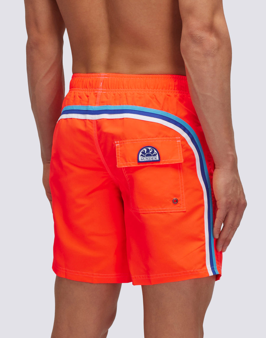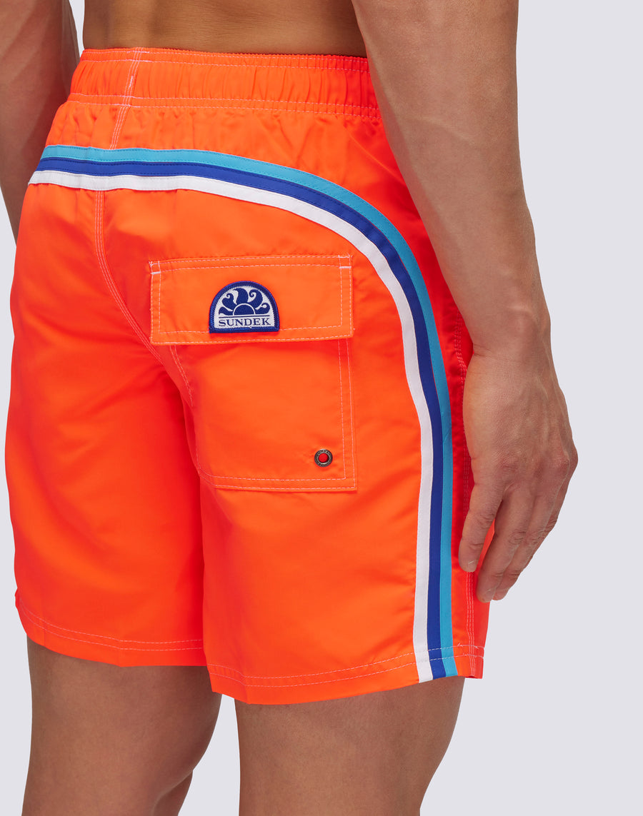 Todo el estilo atemporal de Sundek en este traje de baño con cintura elástica. Moderno, cómodo y diseñado para acompañarte vacaciones tras vacaciones. Nuestro clásico cuenta con ajuste de jareta, el icónico arcoíris contrastante en la parte trasera y está confeccionado en nuestra histórica tela de tafetán de nailon, ligera, resistente y de secado rápido. Incorpora costuras de triple aguja para mayor durabilidad y refuerzo. Largo: 16 pulgadas / 41 cm (talla M), medido desde la parte exterior de la pierna.