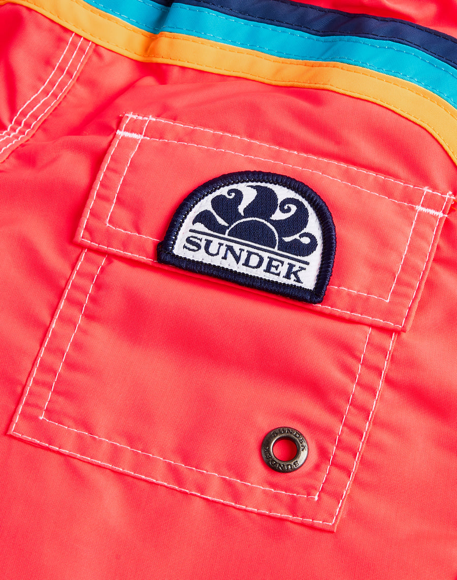 Traje de baño de playa para niño en color intenso, con un tejido ultracómodo y de secado rápido. Es el modelo perfecto para acompañar a tu hijo en todas sus aventuras durante las vacaciones: ligero, práctico y diseñado para que pueda moverse y jugar con total libertad. Confeccionado en nuestro tradicional tafetán de nailon y armado con costuras de tres agujas que garantizan máxima durabilidad. Un básico para empacar año tras año.