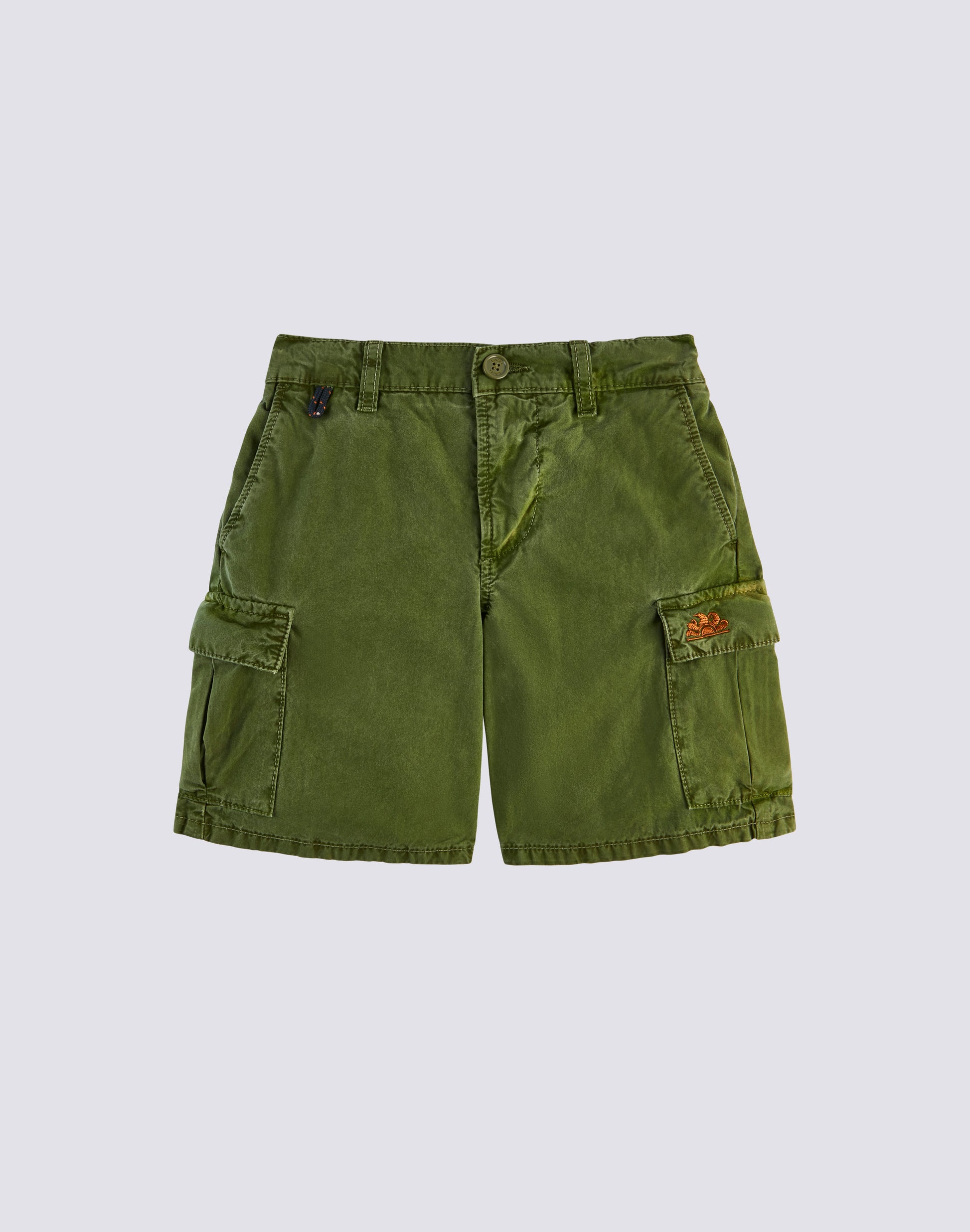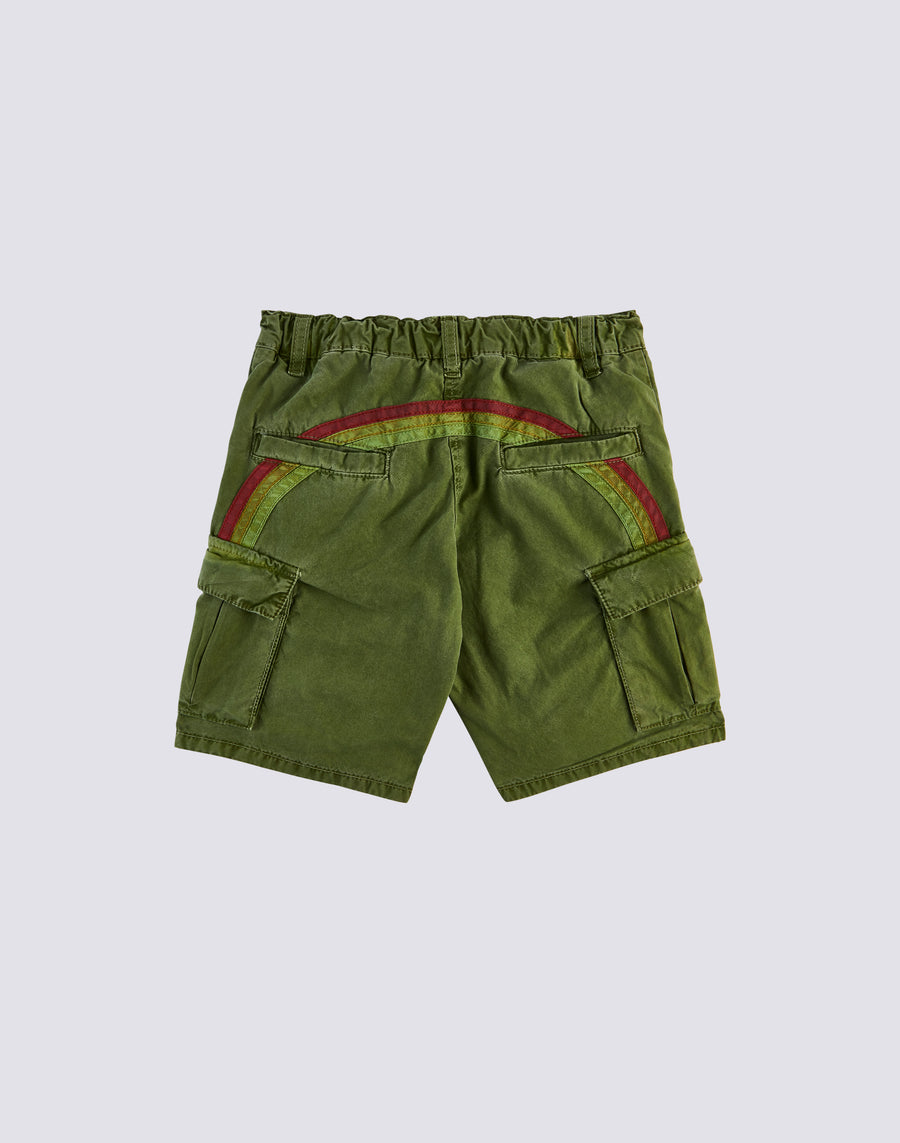 Shorts cargo de popelina de algodón, teñidos en prenda para un look auténtico. Ligeros, cómodos y muy prácticos para que tu pequeño pueda moverse con total libertad. Cuentan con cierre de botón, trabillas para cinturón y el icónico arcoíris en la parte trasera que les da un toque único.